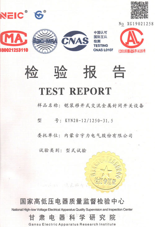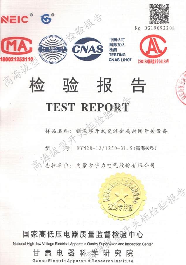 KYN28-12/1250-31.5高海拔型中置式開關柜(試驗報告)