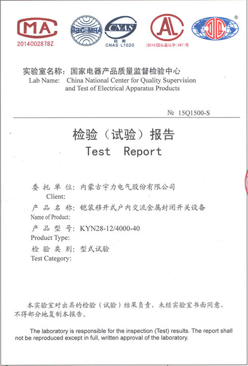 KYN28-12/4000-40中置式開關柜(檢驗報告)